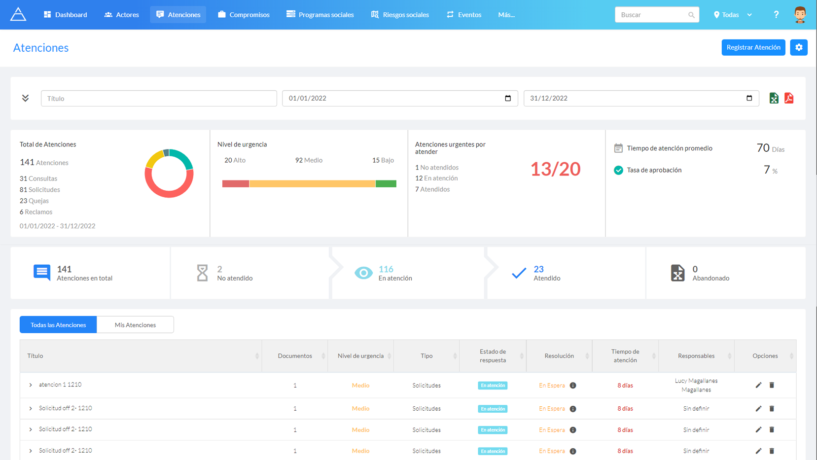 Gestión de Atenciones: Registro de comunicaciones de parte de un actor a la empresa, las cuales pueden ser solicitudes, quejas, reclamos o inquietudes.